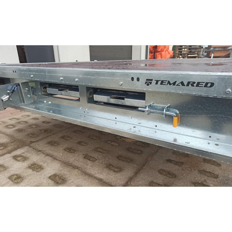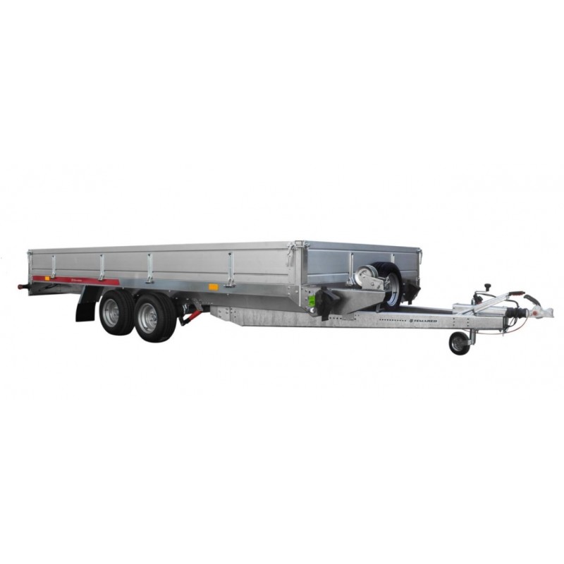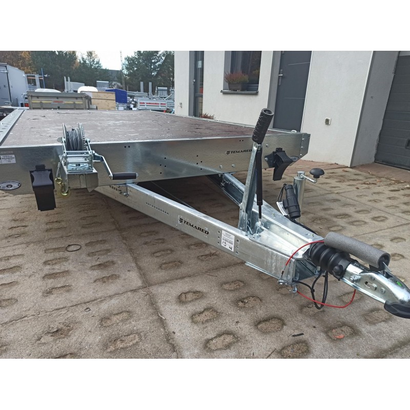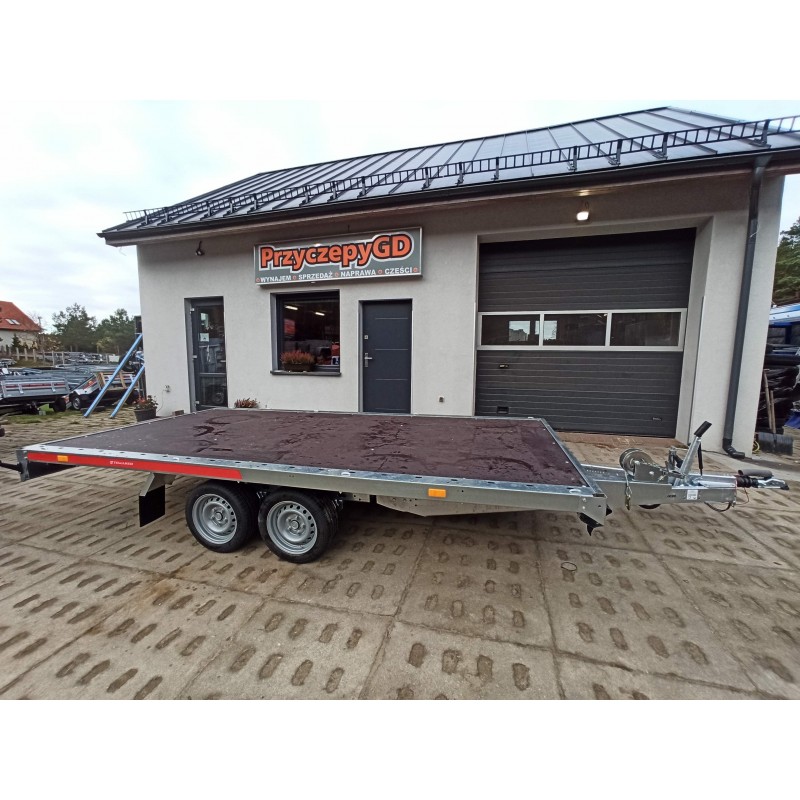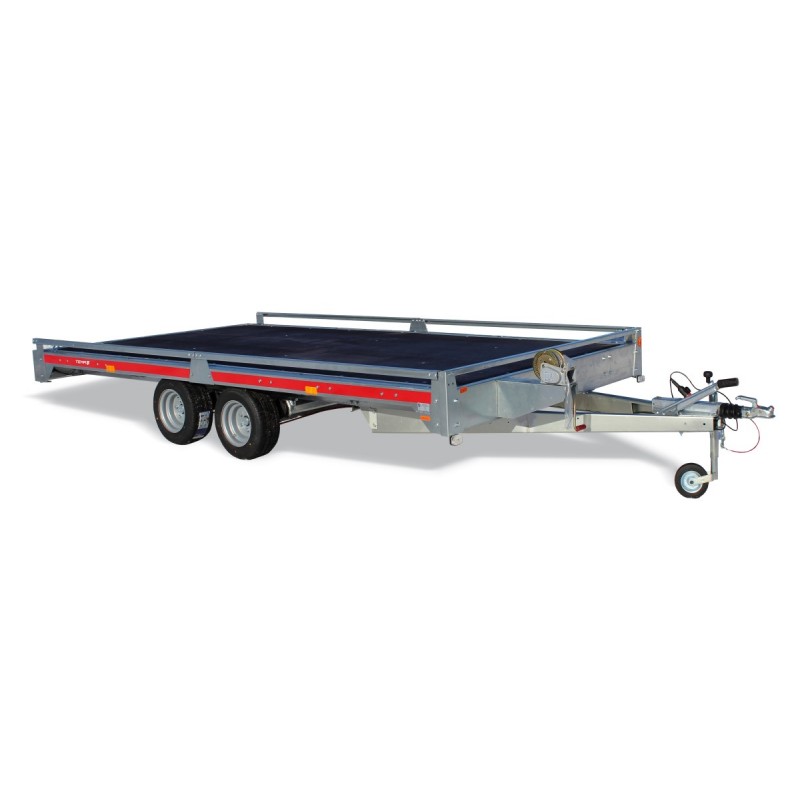 Laweta samochodowa płaska, przyczepa do przewozu towarów oraz pojazdów z hamulcem najazdowym. Najazdy chowane pod podłogą. W opcjo relingi lub stelaż z pokrowcem.