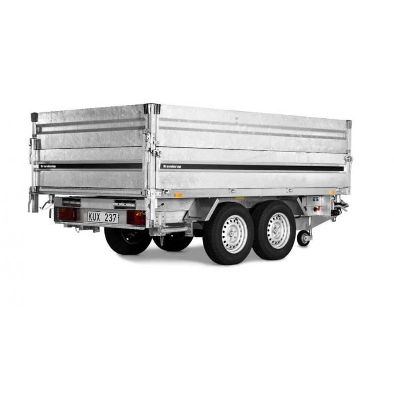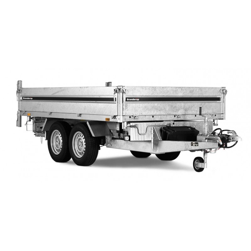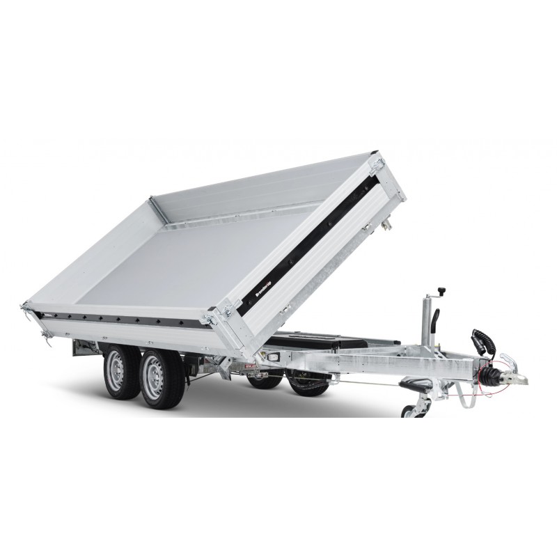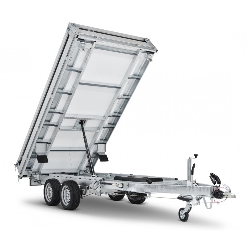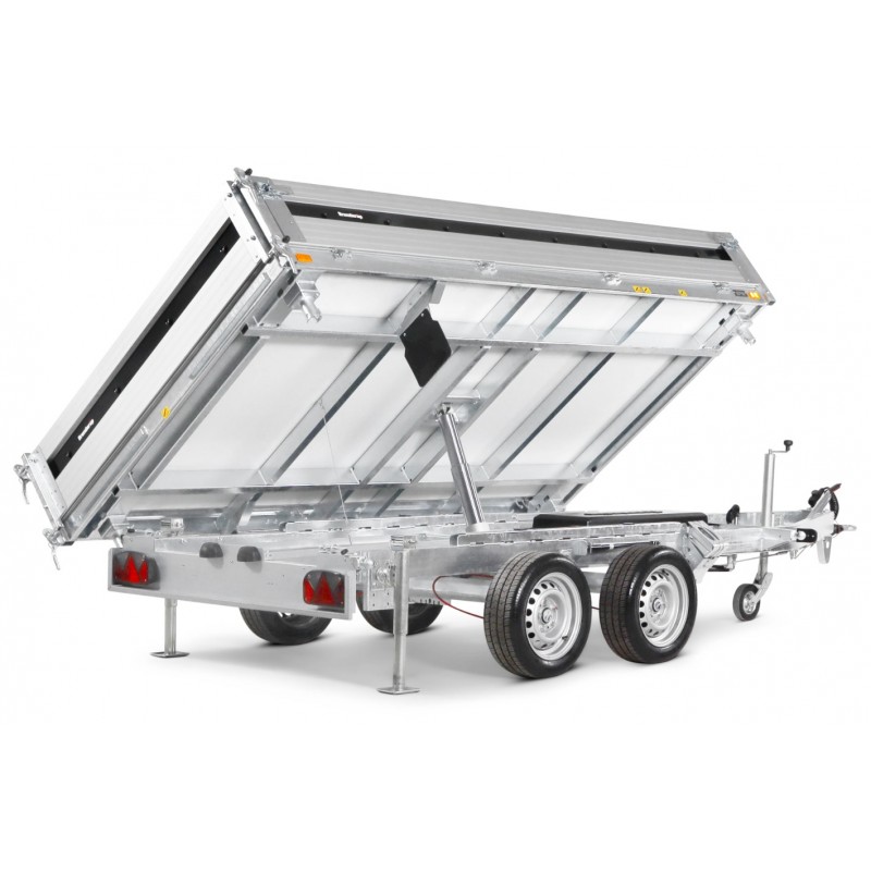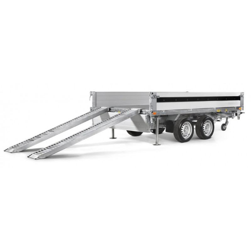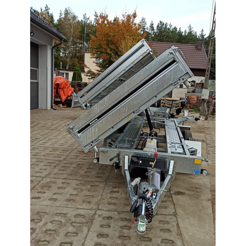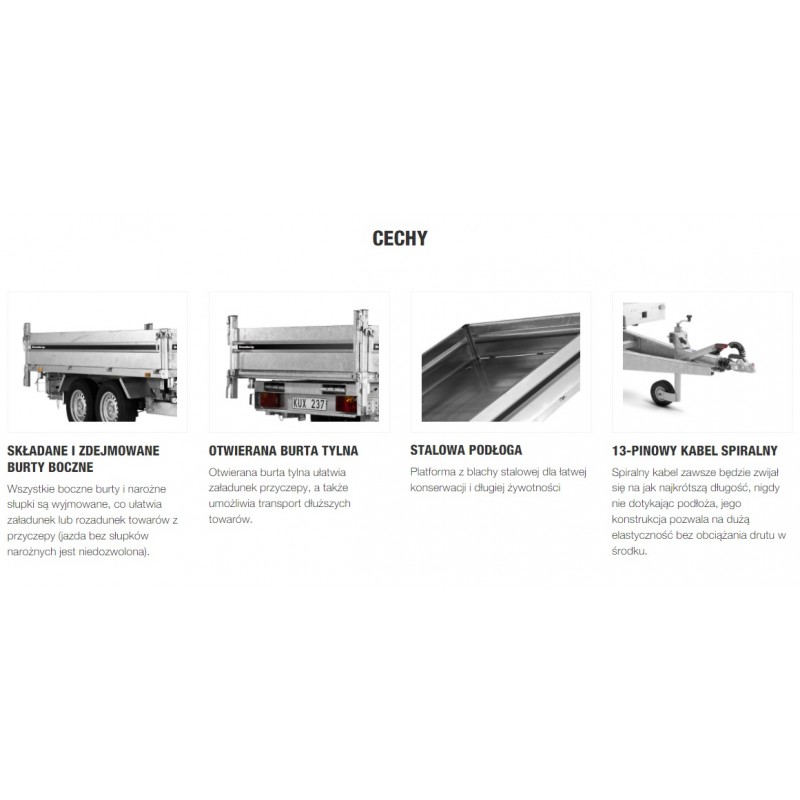 Wysokość załadunku 690 mm ułatwia obsługę, a kąt przechyłu 50° i elektryczna pompa gwarantują szybkie, sprawne rozładunki. Przyczepy są wyposażone w zintegrowane schowki na najazdy pod podłogą, wewnętrzne żeliwne uchwyty mocujące o wytrzymałości 800 kg, zewnętrzne punkty mocowania oraz standardowe oświetlenie LED.