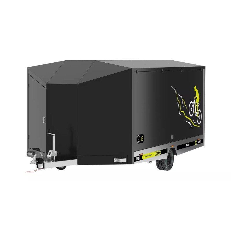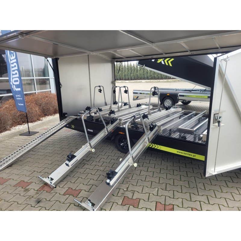 Przyczepa rowerowa PRA400 to jednoosiowa, aluminiowa przyczepa zabudowana (z coverem) do bezpiecznego transportu do 8 rowerów (w tym e-bike’ów). W standardzie posiada oświetlenie LED oraz instalację ładowania (8 gniazd + zewnętrzne przyłącze). Boczna klapa na siłownikach ułatwia szybki załadunek i obsługę. Po doposażeniu w 2-metrowe trapy najazdowe przyczepa nadaje się także do transportu quadów — w granicach DMC i wymiarów przestrzeni ładunkowej.