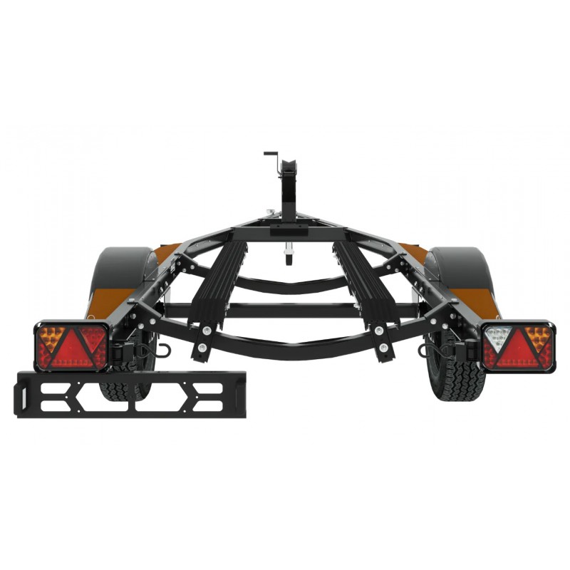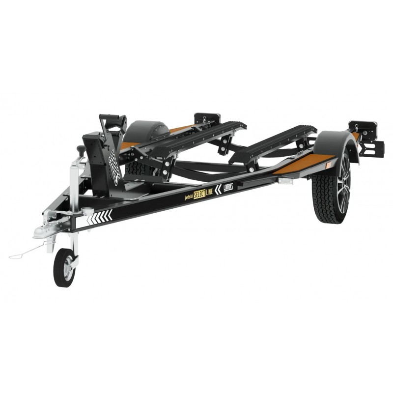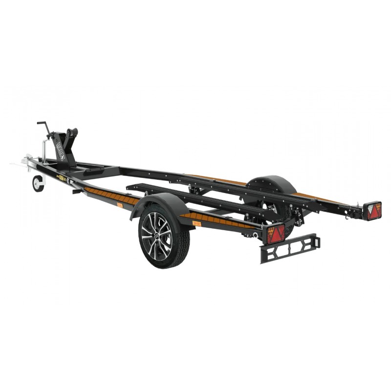 Lekka do transportu skutera wodnego z konstrukcją aluminiową, z płozami regulowanymi w dwóch płaszczyznach umożliwiającymi dostosowanie przyczepy do skutera o dowolnej szerokości. W przedniej belce przyczepy zastosowano gumowy odbojnik, którego zadaniem jest zabezpieczenie napływającego skutera przed uderzeniem w ramę. Dla podniesienia wygody użytkowania przy nadkolach dodaliśmy schodki boczne pokryte tworzywem antypoślizgowym, które ułatwiają dostęp do ładunku i obsługę skutera.